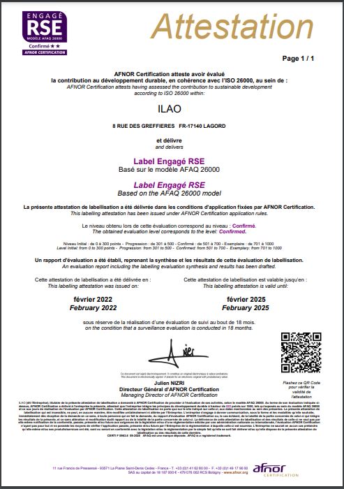 ILAO est labellisé ENGAGÉ RSE – Niveau Confirmé et Responsibility Europe depuis le 15 février 2022. Consultez notre label ci-dessous en version française et anglaise.
